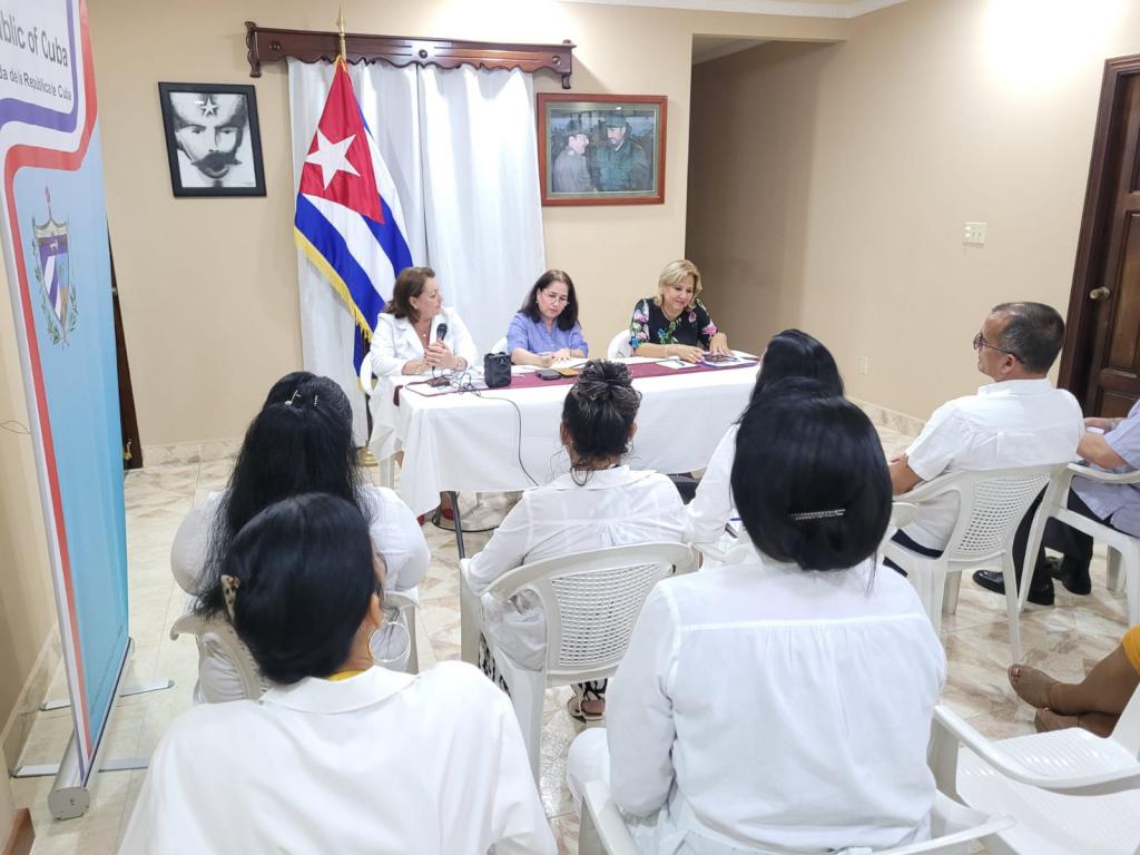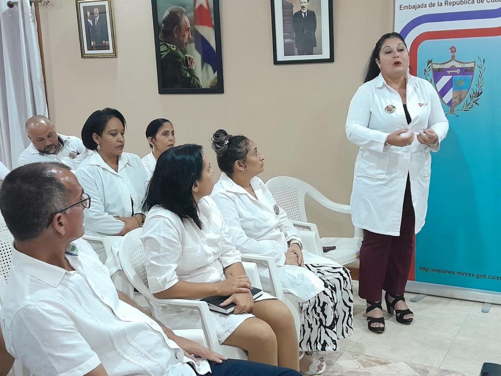 Belmopán, 27 de agosto del 2024.- La embajadora Ana Teresita Fraga González, directora general de Asuntos Consulares y Atención a Cubanos Residentes en el Exterior, se reunió en la sede de la embajada de Cuba en esta capital con una representacion de los colaboradores cubanos de la salud que prestan sus servicios en esta hermana nación centroamericana.