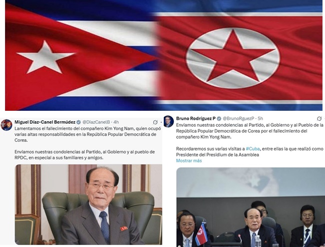 El Primer Secretario del Partido Comunista de Cuba y Presidente de la República, Miguel Díaz -Canel Bermúdez, así como el miembro del Buró Político del Comité Central y Ministro de Relaciones Exteriores, Bruno Rodríguez Parrilla, presentaron sus condolencias al Partido del Trabajo de Corea, al gobierno y pueblo de la RPDC por el deceso del camarada Kim Yong Nam, reconociendo su contribución a su nación y a los lazos que unen a los pueblos de Cuba y la RPDC.