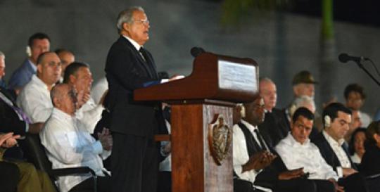 Las nuevas generaciones continuarán impulsando las ideas de Fidel y la Revolución Cubana para seguir transformando nuestras sociedades, volverlas más justas y solidarias. La dimensión humana de Fidel tiene que ver mucho con la grandeza de su pueblo, su generosidad y heroísmo. Cuba es un ejemplo de todo lo que es posible alcanzar por el bienestar y la felicidad de la gente, y lograrlo, incluso, en medio de un injusto bloqueo de más de 50 años impuesto por Estados Unidos (Aplausos).