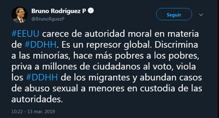 La Habana, 13 de marzo de 2019.- Estados Unidos carece de autoridad moral en materia de derechos humanos, advirtió hoy el canciller de Cuba, Bruno Rodríguez, en momentos en los que Washington apela al tema para atacar a otros países.