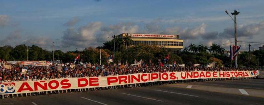 A 132 años de los sucesos de Chicago, que dieron lugar al Día Internacional de los Trabajadores, el pueblo cubano fue protagonista de una jornada de celebración, como prueba de su apoyo a la Revolución, al Partido, y a la nueva dirección del país.En la capitalina Plaza de la Revolución, el acto central por la fecha aglutinó a cerca de 900 000 personas, y estuvo presidido por el General de Ejército Raúl Castro Ruz, Primer Secretario del PCC, Miguel Díaz-Canel Bermúdez, Presidente de los Consejos de Estado y de Ministros, y otros dirigentes.La estratégica batalla en el terreno económico-productivo desde las empresas, unidades presupuestadas y las formas de gestión no estatal, en medio de las complejidades que hoy vivimos, requiere como nunca antes del aporte obrero por elevar y diversificar de manera sostenida las producciones físicas, potenciar los renglones exportables, sustituir importaciones y mejorar la calidad de los servicios, unido a la necesaria eficiencia del proceso inversionista que se ejecuta en los programas nacionales de desarrollo, destacó Ulises Guilarte de Nacimiento, secretario general de la Central de Trabajadores de Cuba.Añadió que en la consecución de estos propósitos «tenemos plena conciencia de la responsabilidad de la clase obrera en la generación de las riquezas que necesita nuestro pueblo para satisfacer sus necesidades, preservar las conquistas sociales y convertirse en premisa para elevar los ingresos reales de trabajadores y jubilados».Por otra parte, Esteban Lazo Hernández, miembro del Buró Político y presidente de la Asamblea Nacional del Poder Popular, estuvo al frente de la celebración en Santiago de Cuba, donde desfilaron 16 bloques de santiagueros, portando banderas cubanas, del 26 de Julio y fotos de Fidel y Raúl. Asimismo, en San José de las Lajas, sede de las actividades centrales de Mayabeque, el desfile lo encabezó Salvador Valdés Mesa, primer vicepresidente cubano.