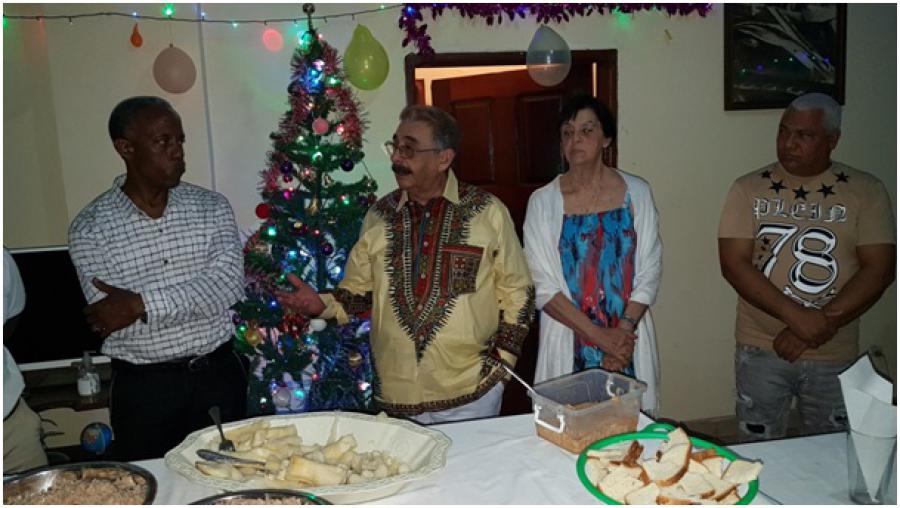 En la sede de la Brigada Médica Cubana en Conakry, se reunieron los miembros de la Misión Diplomática y colaboradores para festejar el 60 aniversario de la Revolución Cubana. El Embajador, Roberto Rodríguez Peña, destacó los logros y desafíos por los que ha tenido que transitar nuestra Revolución y agregó que gracias a la obra y el pensamiento del líder histórico de la Revolución, el Comandante en Jefe, Fidel Castro Ruz, hoy podemos disfrutar con orgullo los beneficios materiales y espirituales así como su carácter humano de este, el más relevante hecho histórico en América Latina y el Caribe. Por ello daremos continuidad a los logros y victorias de la patria.
