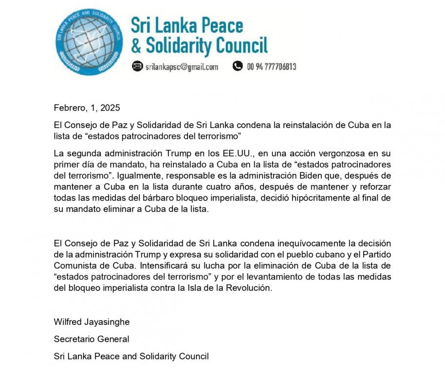 El Consejo de Paz y Solidaridad de Sri Lanka condena inequívocamente la decisión de la administración Trump y expresa su solidaridad con el pueblo cubano y el Partido Comunista de Cuba. Intensificará su lucha por la eliminación de Cuba de la lista de “estados patrocinadores del terrorismo” y por el levantamiento de todas las medidas del bloqueo imperialista contra la Isla de la Revolución.