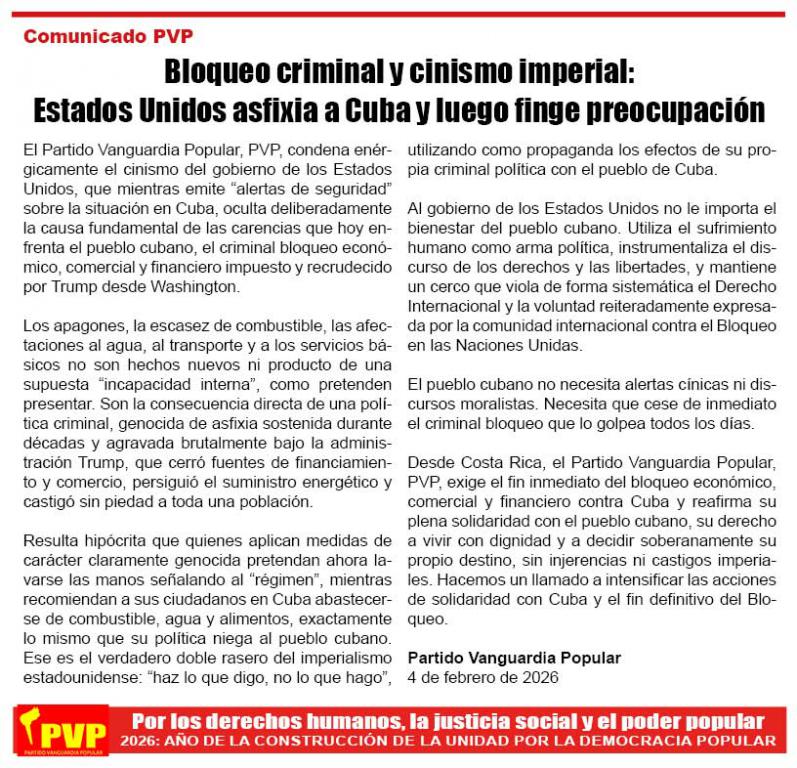 Desde Costa Rica, el Partido Vanguardia Popular, PVP, exige el fin inmediato del bloqueo económico, comercial y financiero contra Cuba y reafirma su plena solidaridad con el pueblo cubano, su derecho a vivir con dignidad y a decidir soberanamente su propio destino, sin injerencias ni castigos imperiales. Hacemos un llamado a intensificar las acciones de solidaridad con Cuba y el fin definitivo del Bloqueo.