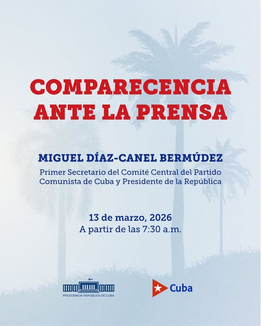 El Primer Secretario del Comité Central del Partido Comunista y Presidente de la República, Miguel Díaz-Canel Bermúdez, comparecerá ante los medios este viernes 13 de marzo de 2026, a partir de las 7:30 am, para abordar asuntos del acontecer nacional e internacional.