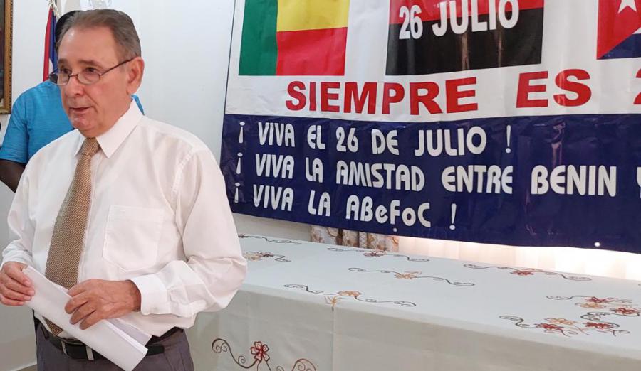 Cotonou, 24 de julio del 2022.- La Embajada de Cuba en Benín celebró el 26 de julio junto a miembros de la Asociación de Benineses Formados en Cuba, la embajadora de Venezuela, Excelentísima Sra Belen Orsini, el Excelentísimo Cónsul Honorario de Colombia, Roger Antoine, la Sra Landros, líder de la Asociación de Mujeres Jóvenes, Sitsope Le Refuge, y cubanos residentes en este país. El Secretario General de ABeFoC, el Dr. Marcellin C. Takin recordó en su emotivo discurso que para los cubanos y para todas las personas que en el mundo aman a Cuba, no existe una fecha más importante que la del 26 de julio y volvió a patentizar el apoyo incondicional de su organización al pueblo y gobierno revolucionarios. Por su parte, la Excelentísima embajadora de Venezuela, Belen Orsini repasó en breves, pero muy sentidas palabras, el significado de esta fecha histórica no solo para los cubanos, sino para todos los amantes de la paz. El embajador Ricardo García Napoles, Encargado de Negocios a.i en sus palabras de conclusión del acto, reiteró que la Revolución ha sido puesta a prueba en innumerables ocasiones y ha salido victoria, siempre inspirados en Fidel, Raúl y Díaz Canel y reafirmó que no existe otra alternativa que la de salir victoriosos. (EMBACUBA/BENIN)