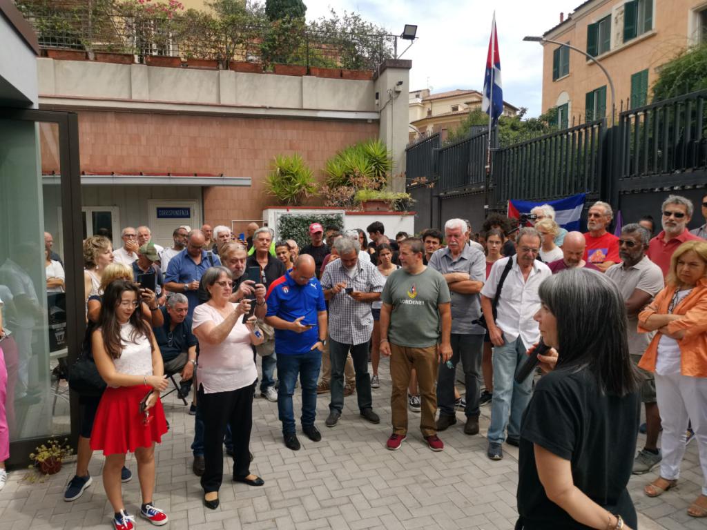 Roma, 26 de julio de 2023.- Con un ¡Viva Cuba y el 26 de Julio!, dio inicio en la Embajada de Cuba en Italia, el acto por el 70 Aniversario de los Asaltos a los Cuarteles Moncada de Santiago de Cuba y Carlos Manuel de Céspedes, de Bayamo. Además del colectivo de funcionarios y trabajadores de la Misión, presididos por la Embajadora Mirta Granda, se encontraban presentes numerosos representantes de las asociaciones y fuerzas políticas, que integran el movimiento de solidaridad.