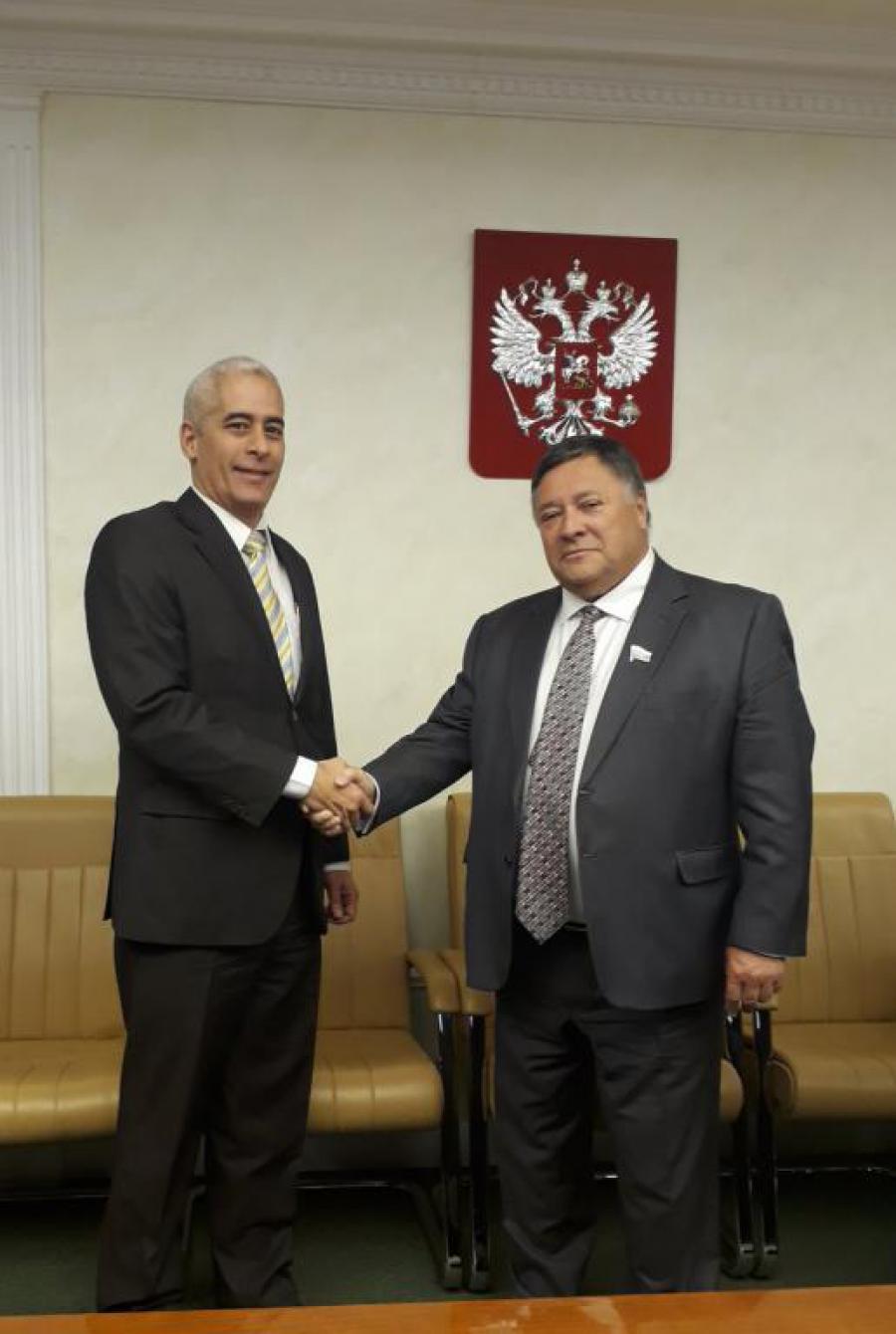 Rusia, 16 de marzo. El embajador de Cuba en Rusia Gerardo Peñalver Portal fue recibido por el senador Serguei Kalashnikov en la sede de la Cámara Alta de la Asamblea Federal de Rusia.