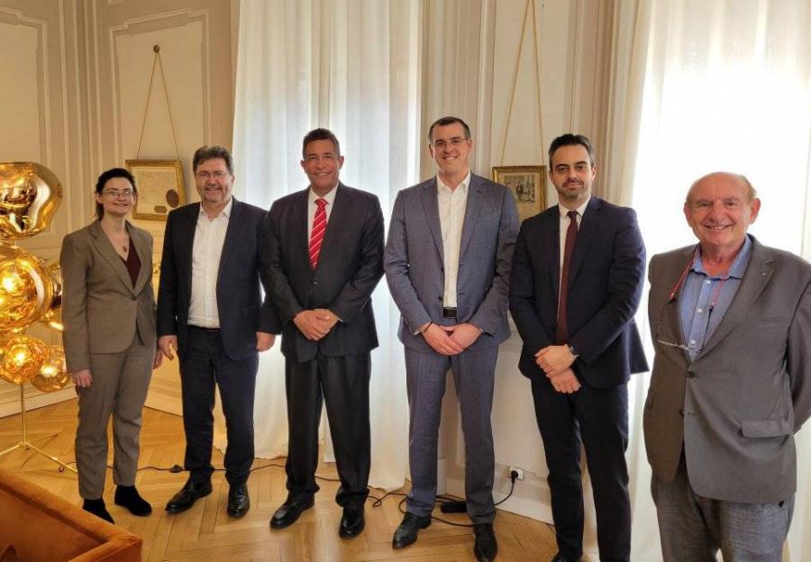 Paris, 10 de abril - El embajador de Cuba en Francia, Otto Vaillant Frías, se entrevistó en la sede de la Cámara de Comercio e Industrias de Toulouse, con Patrick Piedrafita, Presidente de esta institución; Johan Clochet, Vice-Presidente de la Confederación de Pequeñas y Medianas Empresas (CPME31) y miembro del gabinete de la CCI; y Nicolas Poux, Delegado General de la CPME31.