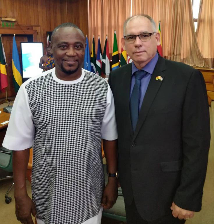 Accra, 21 julio, 2025. – El Embajador de la República de Cuba Julio E. Pujol Torres sostuvo un encuentro de trabajo con el Dr. Karl Mark Arhin, graduado en Cuba y Subdirector de Relaciones Internacionales del Congreso Nacional Democrático, NDC por sus siglas en inglés, partido de gobierno en Ghana.