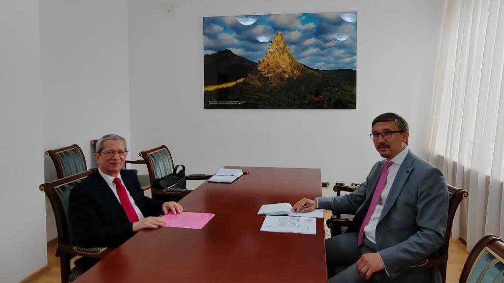 Astaná, 28 de junio de 2024. El embajador de Cuba, Oscar Santana León, sostuvo un encuentro con el director de la Dirección de Canadá, América Latina y Caribe, Azamat Kairolda, en la sede del Ministerio de Asuntos Exteriores de la República de Kazajstán.