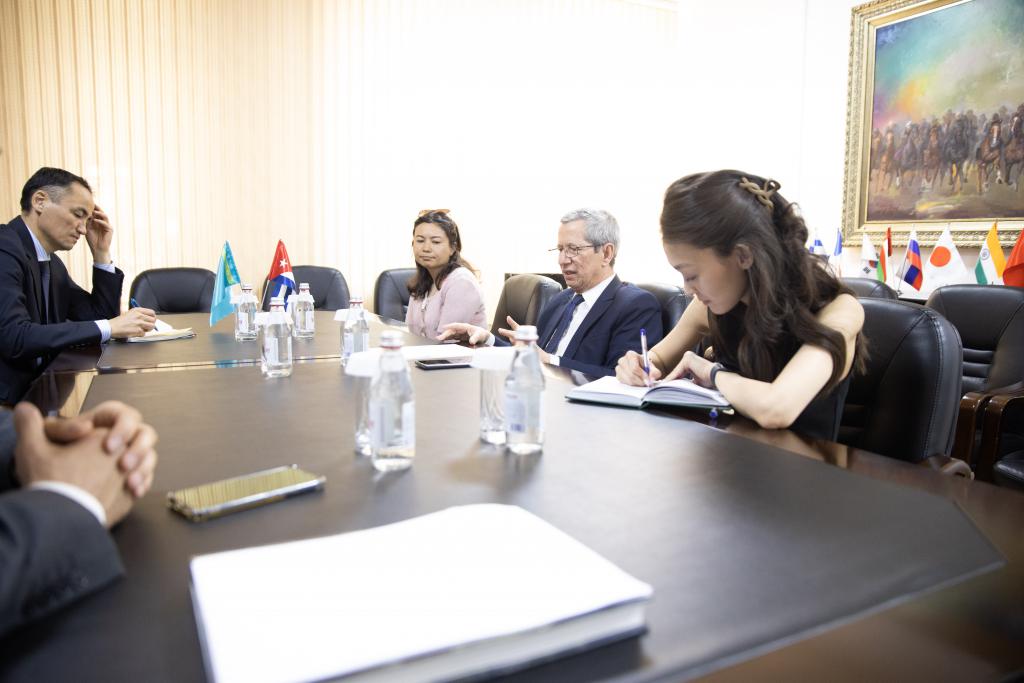 Astaná, 2 de junio de 2023. El embajador de Cuba, Oscar Santana León, visitó la sede de la Universidad Internacional de Astaná, donde sostuvo un ameno intercambio con el presidente de esa institución docente de altos estudios, Serik Irsaliyeev, quien estuvo acompañado por Kairat Abdrakhmanov, vicepresidente de Desarrollo Estratégico, Sergei Zhmaka, Jefe del Departamento de Cooperación Internacional y Rigina Syssoyeva, profesora de la Facultad de Ciencias Sociales y Humanitarias.