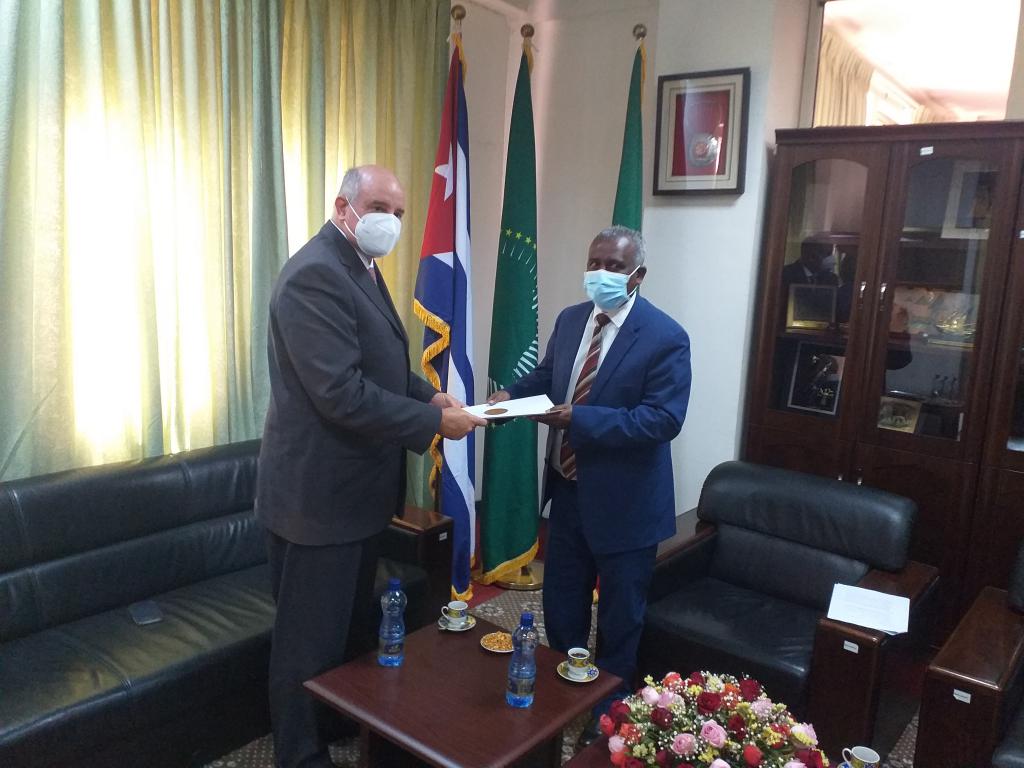 Addis Abeba, 9 de diciembre de 2021. En la mañana de este jueves, el Embajador de Cuba designado en Etiopía, Jorge Lefebre Nicolás, presentó sus Copias de Estilo al Jefe de Protocolo interino de la Cancillería etíope, Embajador Alemayehu Sewagen, en la sede de esa institución gubernamental.