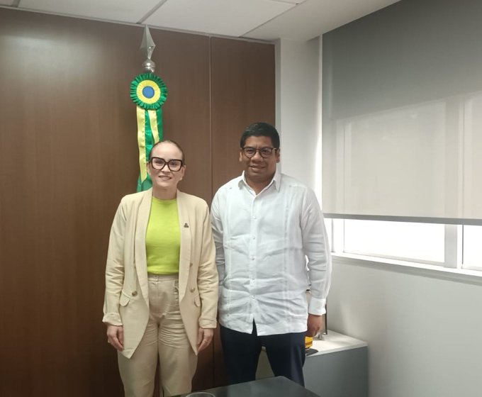 Brasilia, 14 de abril de 2026. El embajador cubano Victor Cairo intercambió con Fernanda Mara de Oliveira Macedo Pacobahyba, presidenta del Fondo Nacional de Desarrollo de la Educación. Se conversó sobre asuntos de interés común como el programa nacional.de.alimentación escolar.