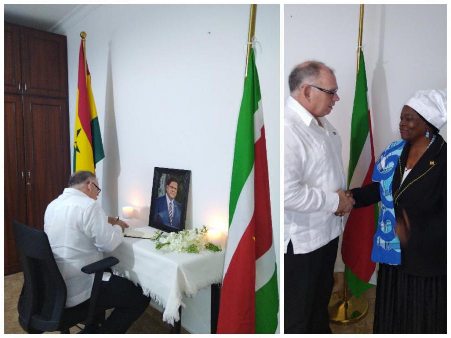 Accra, 7 de abril. - El Embajador de Cuba en Ghana Julio E. Pujol Torres firmó el Libro de Condolencias abierto en la Embajada de la República de Surinam en Accra, con motivo del fallecimiento del ex Presidente surinamés Excmo. Sr. Chandrikapersad Santokhi.