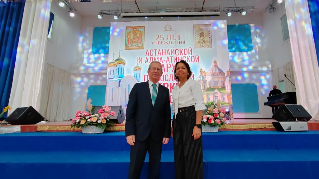 Astaná, 29 de septiembre de 2024. El Embajador de Cuba, Oscar Santana León, acompañado de la Encargada de Asuntos Consulares, Neudys Casanova Mendoza, asistió a la celebración del 25º aniversario de la fundación de la Diócesis de Astaná de la Iglesia Ortodoxa de Kazajstán, que tuvo por sede el Centro Espiritual y Cultural “Apóstoles Cirilo y Metodio” en la Catedral de la Asunción en esta capital.