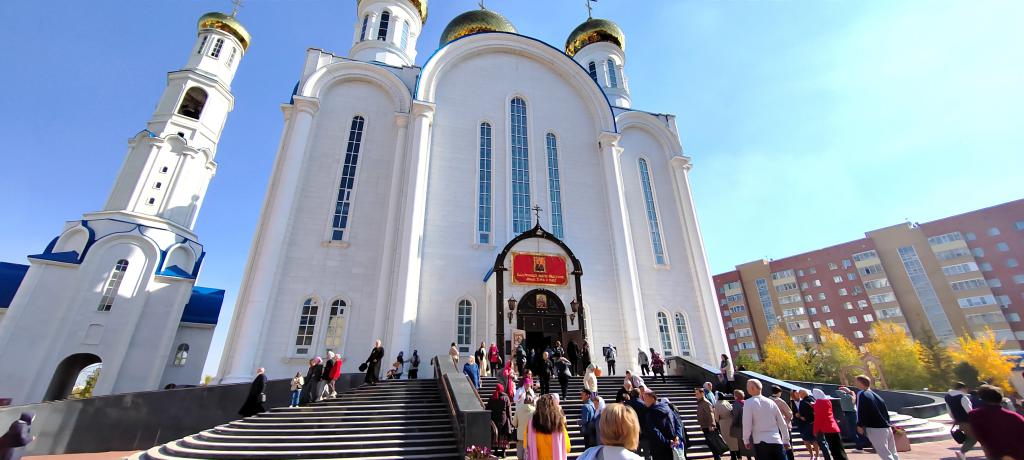 Este domingo, con sol radiante y agradable temperatura, inusual para la época del año aquí, cientos de creyentes ortodoxos asistieron a la Catedral de la Asunción para hacer votos con motivo del traslado a Kazajstán de las reliquias de la Beata Matrona de Moscú.