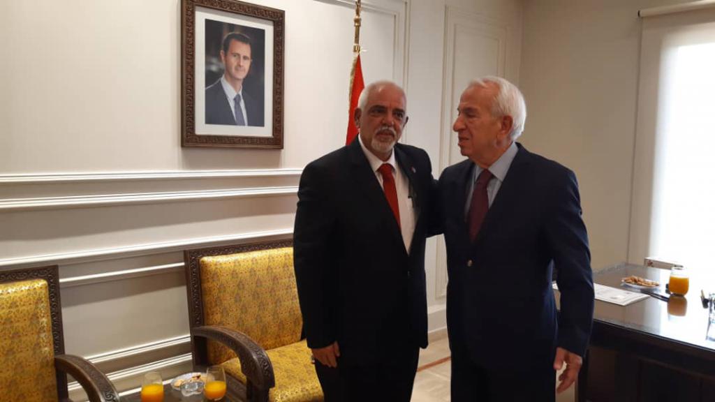 Damasco, 12 de mayo. Embajador de Cuba en Siria, Luis Mariano Fernández realiza visita de cortesía al presidente de la Federación de las Cámaras de Comercio de Siria, Abulhuda Lahham, con el fin de explorar posibilidades de acercamiento empresarial entre Siria y Cuba.