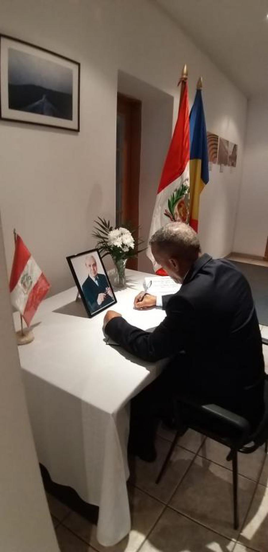 Bucarest, 10 de marzo de 2020. El embajador de Cuba, Roberto César Hamilton, acudió a la Embajada del Perú para firmar el libro de condolencias por el deceso del diplomático Javier Pérez de Cuellar, ex Secretario General de las Naciones Unidas, ex Primer Ministro y Ministro de Relaciones Exteriores del Perú.