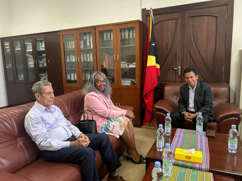 Dili, 10 de septiembre de 2025. El nuevo Secretario General del ministerio de Negocios Extranjeros y Cooperación del país, Juvencio Martins, acompañado por su director general para América, Europa y África, Ivens G. de Sousa, junto a equipo de trabajo, recibieron en la Cancillería a la jefa de Misión diplomática Alina Aldama, quien estuvo asistida por el ministro-consejero Pablo Romero y el secretario Antonito Amaral. Durante el encuentro de cortesía se ofreció una actualización y revisión a los temas bilaterales de mutuo interés.