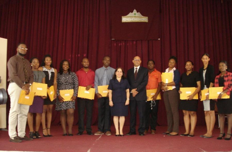 St. George`s, 10 de agosto del 2017. - Organizada por el Ministerio de Educación y Desarrollo de Recursos Humanos tuvo lugar la Ceremonia de entrega de becas a estudiantes granadinos seleccionados para cursar estudios universitarios y de post grado en la República de Cuba, la República Popular China, la República de Trinidad y Tobago y la Universidad de St. George´s; la cual tuvo lugar en el teatro de la Escuela Secundaria GBSS.