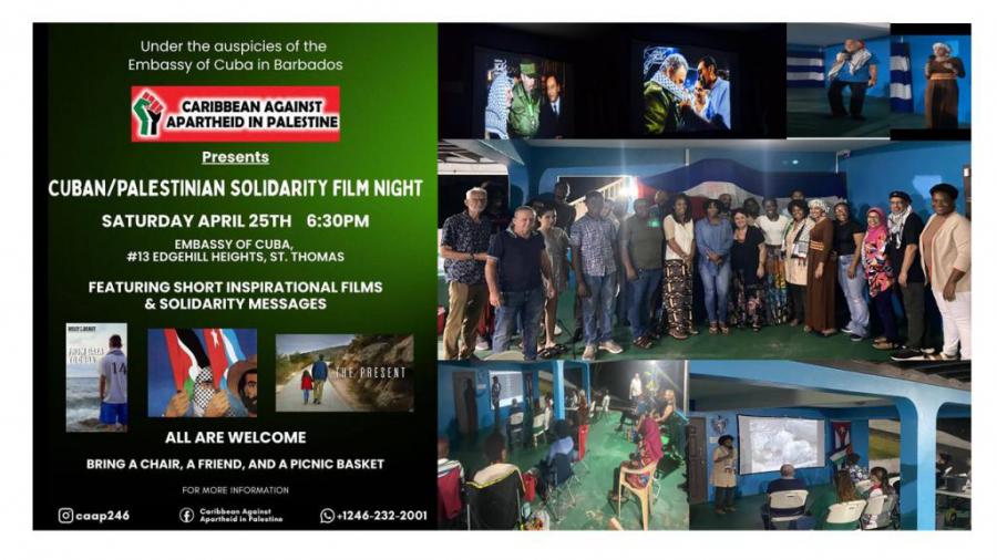 En la noche de este 25 de abril, en la Sede de la Embajada de la República de Cuba en Barbados, tuvo lugar la exhibición de una Muestra de Cine Cubano-Palestino, con la presentación de varios films que recogen la historia de dos pueblos que han sido víctimas de la ambición del imperialismo por décadas, pero que han demostrado una incalculable resiliencia a partir de históricas tradiciones de lucha.