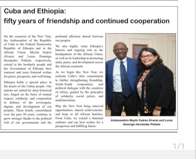 Addis Abeba, 1 de enero de 2026.- Con motivo del Año Nuevo, los Embajadores de la República de Cuba ante la República Democrática Federal de Etiopía y la Unión Africana, Meylin Suárez Álvarez y Lucas Domingo Hernández Polledo, respectivamente, expresan al hermano pueblo y Gobierno de Etiopía nuestros más cálidos y fraternales deseos de paz, prosperidad y bienestar.