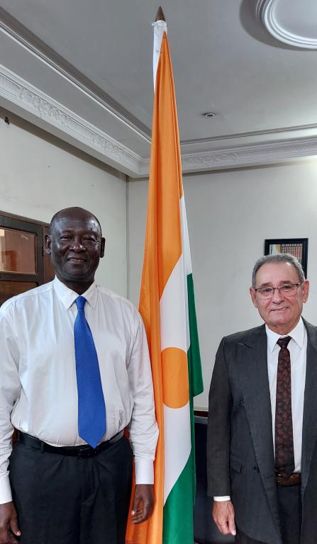 Cotonou, 29 de julio del 2022.- Ricardo García Nápoles, Jefe de Mision de Cuba en Benín, sostuvo un fraternal encuentro con el embajador de Níger, el Excelentísimo Sr. Sidi Abdou. Ambos diplomáticos abundaron en las históricas relaciones bilaterales entre los dos países. El Embajador nigerino agradeció al gobierno cubano por la importante colaboración médica, a la vez que elogió el prestigio de los galenos de la Mayor de las Antillas en todo el mundo. Por su parte, el diplomático cubano agregó que se trata de saldar una deuda histórica con los países africanos, como calificara nuestro Comandante en Jefe la colaboración con Africa. (EmbaCuba/Benín)