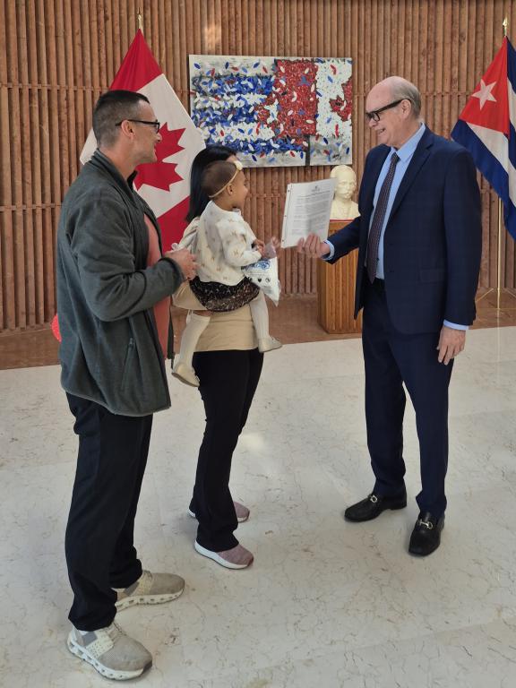 Ottawa, 7 de abril de 2026 - En el marco de las celebraciones por el 4 de abril, fecha de profundo significado para la juventud y niñez en la Isla, la Embajada de la República de Cuba en Canadá realizó un emotivo acto de entrega de la ciudadanía cubana a una niña canadiense, reafirmando así los lazos indisolubles que unen a las nuevas generaciones con su Patria.