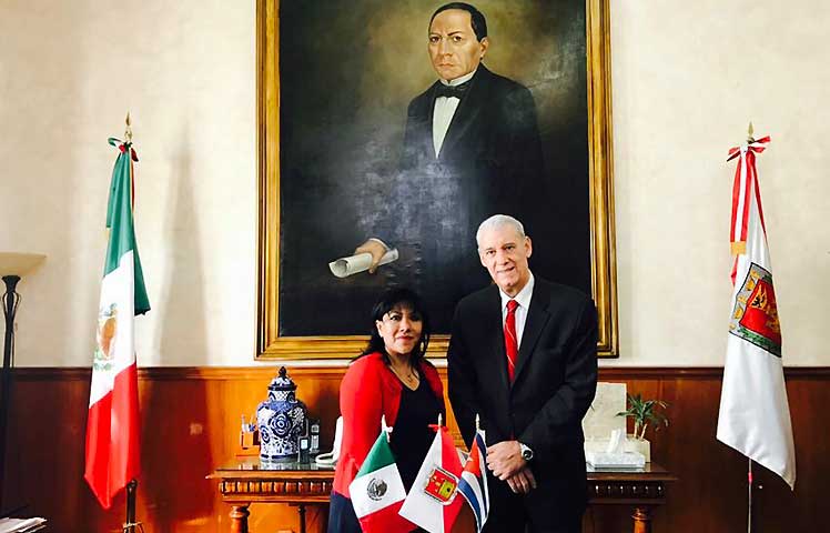 La presidenta municipal Anabell Ávalos entregó a Núñez Mosquera la LLave de la Ciudad y le informó del interés de su administración por estrechar acciones de colaboración y hermanamiento con Cuba.