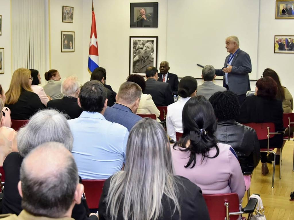 Moscú, 1 oct. El presidente de la Asamblea Nacional del Poder Popular de Cuba (ANPP-Parlamento), Esteban Lazo, dialogó hoy con los miembros de la misión estatal cubana en Rusia.