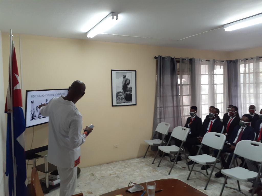 Puerto Príncipe, 01 de diciembre de 2020.- Jóvenes estudiantes del Instituto de Diplomacia y Relaciones Internacionales de Cabo Haitiano fueron recibidos en la sede de la Embajada de Cuba en Haití, donde el jefe de la Oficina Consular, Alexis Peña Orozco, les ofreció una conferencia sobre la figura del Comandante en Jefe, Fidel Castro, y el bloqueo impuesto por el gobierno de Estados Unidos a nuestro país.