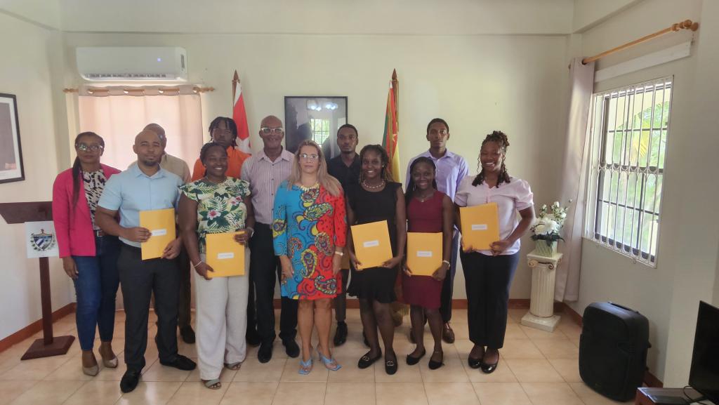 St. George´s, 05 septiembre de 2025. En la sede de la Embajada de Cuba en Granada tuvo lugar la ceremonia de entrega de las becas otorgadas a nueve estudiantes granadinos, con la presencia del Secretario Permanente del Ministerio de Educación Sr. Elvis Morain, la Sra Kizelle Gilbert responsable del Departamento de Becas, la Embajadora de Cuba Ivette Martínez Leyva, el Dr Malachy Dottin, presidente del Comité de estudiantes egresados de Cuba y otros invitados.
