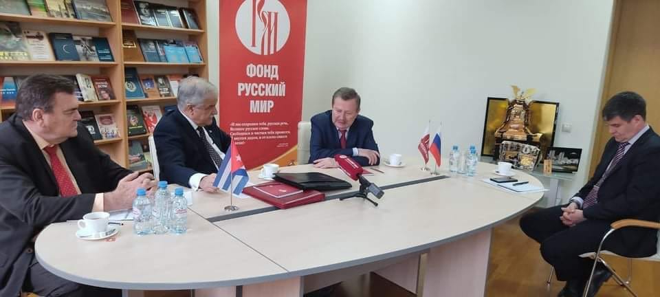 Moscú, 9 de abril de 2021.- El Embajador de Cuba en la Federación de Rusia Julio Garmendía Peña y el Director Ejecutivo del Fondo Russkiy Mir, Vladimir Kochin evaluaron la colaboración educativa entre los dos países, y específicamente la marcha del Programa de Becas que cuenta con la participación decisiva de esta institución rusa.