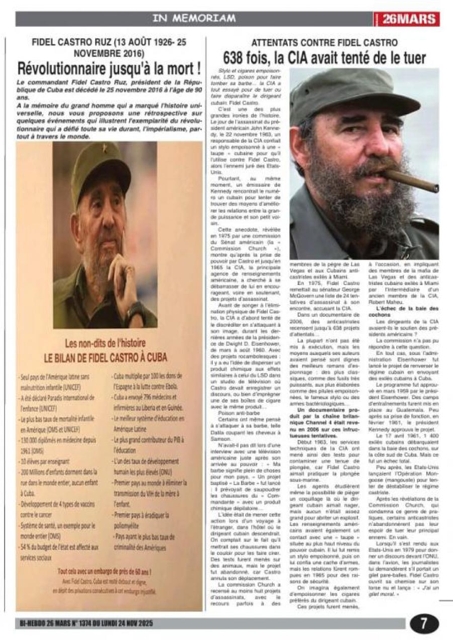 La redacción de “26 Mars” se refirió también a los 638 planes de asesinato elaborados o apoyados por la CIA contra Fidel Castro, quien falleciera a los 90 años de edad, el 25 de noviembre de 2016, por causas naturales y rodeado de sus seres queridos, absuelto por la historia, consagrado por el cariño y la gratitud de su pueblo.