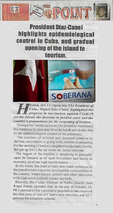 Banjul, 15 oct.- El diario gambiano The Point destacó hoy declaraciones del presidente cubano, Miguel Díaz-Canel, quien ponderó los avances de la vacunación contra la Covid-19 en la isla, el descenso de los casos positivos, y anuncio la apertura gradual de su país al turismo.