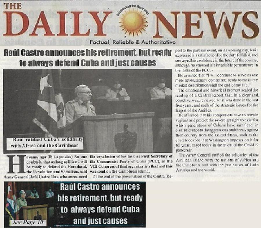 Banjul, 19 abr.- El diario gambiano Daily News exalta hoy la emotiva e histórica intervención del General de Ejército Raúl Castro en la sesión inaugural del Congreso del Partido Comunista de Cuba (PCC), que concluirá este lunes en La Habana.
