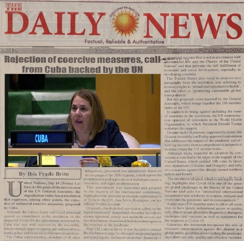 Banjul, 16 sept.- Cuba recibió un nuevo apoyo abrumador en la ONU, al ser adoptada una resolución enmendada a propuesta suya que insta enérgicamente a oponerse a cualquier política económica unilateral y sanciones financieras o comerciales, exalta hoy el diario gambiano Daily News.