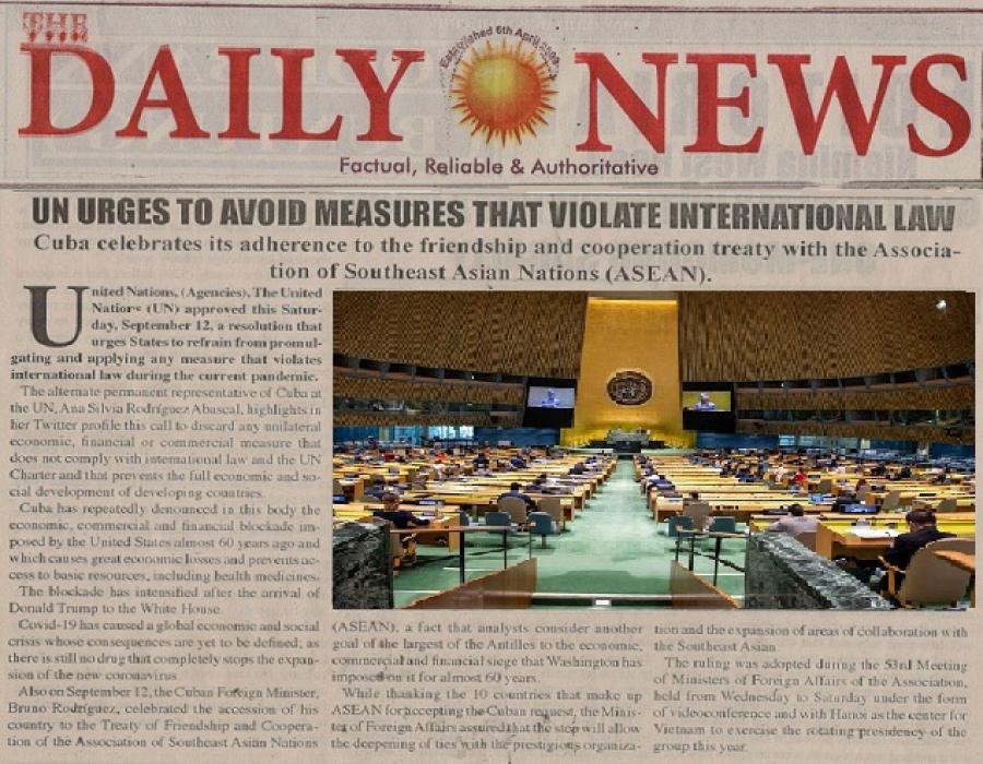 El rotativo de esta nación del occidente africano publica en su edición impresa de este miércoles dos trabajos periodísticos acerca del dictamen aprobado en Naciones Unidas, antes del comienzo oficial la víspera del 75 Periodo de Sesiones de la Asamblea General de la ONU (AGNU).