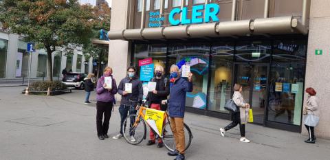 Berna, 29 de octubre de 2020.- Con vigilias frente a sucursales del Banco Cler en diferentes ciudades suizas, miembros y activistas de la Asociación Suiza-Cuba, de MediCuba-Suiza y la Asociación Alba-Suiza, denunciaron esta semana el recrudecimiento del bloqueo económico, comercial y financiero de Estados Unidos contra Cuba y su aplicación extraterritorial por los bancos suizos, que al largo de los años se han ido sumando uno tras otro a esta política.