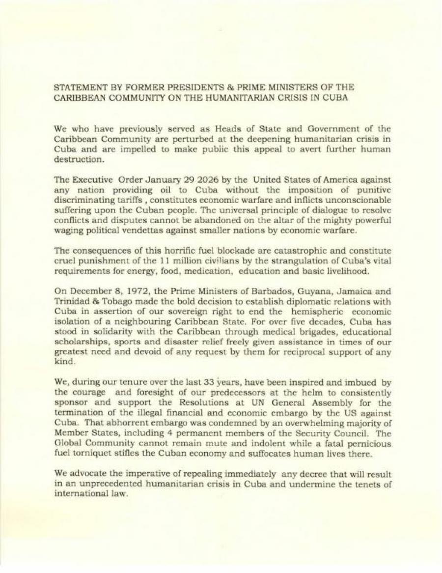 Guyana, Georgetown, 20 de febrero de 2026. Un expresidente y siete ex primeros ministros de países miembros de CARICOM emitieron una declaración el 19 de febrero de 2026, expresando su preocupación por las devastadoras consecuencias de un bloqueo absoluto al suministro de petróleo desde terceros países hacia Cuba, establecido mediante la Orden Ejecutiva del Presidente de EE. UU. del 29 de enero de 2026, la cual amenaza con imponer aranceles comerciales a los países que suministren petróleo a Cuba.