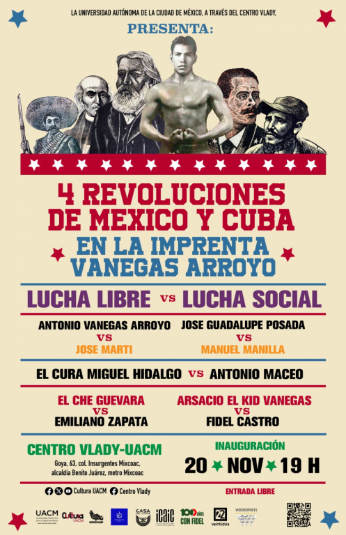Ciudad de México.– Un amplio colectivo de amigos, en colaboración con el Centro Vlady, la Universidad Autónoma de la Ciudad de México (UACM), el Centro Fidel Castro, la Casa del Caribe de Santiago de Cuba, la Embajada de Cuba en México y el Movimiento Mexicano de Solidaridad con Cuba, entre otras organizaciones, presentarán la exposición: "4 Revoluciones de México y Cuba en la Imprenta Vanegas Arroyo".
