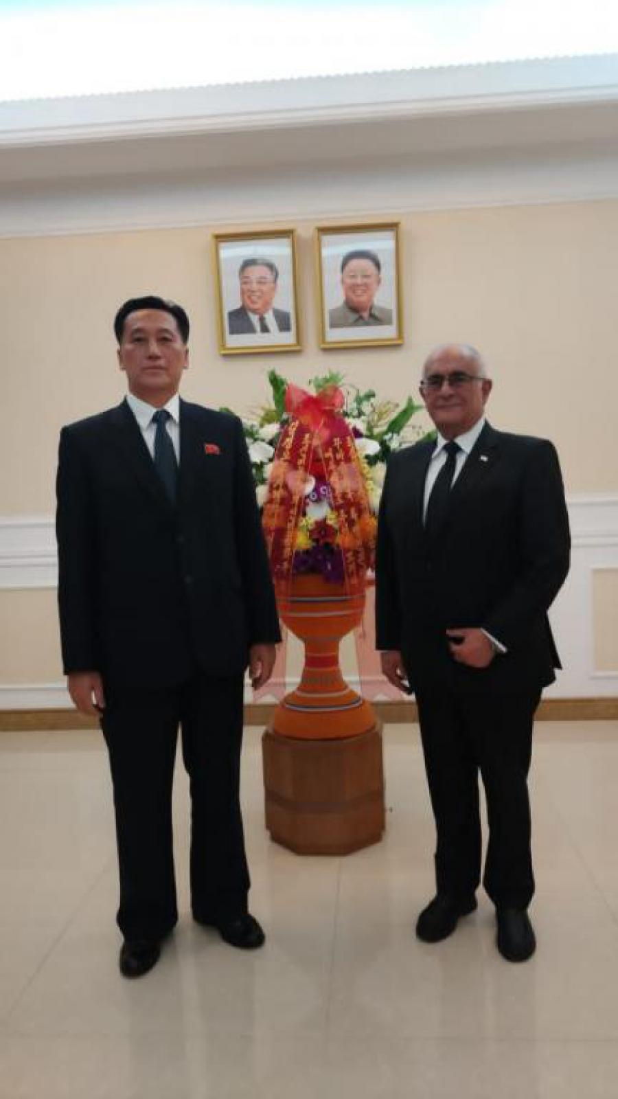 Pyongyang, 26 de marzo de 2026 --El embajador de Cuba en la República Popular Democrática de Corea, Eduardo Luis Correa García, entregó en nombre el Estado cubano y del Partido Comunista de Cuba una carta de felicitación y un cesto floral en ocasión de la reelección del Camarada Kim Jong Un, al cargo de Presidente de Asuntos Estatales de la República Popular Democrática de Corea el pasado 22 de marzo de 2026 en la XV sesión de la Asamblea Popular Suprema. La misiva trasladaba además que la decisión legislativa expresa la voluntad popular, y es resultado de su esfuerzo personal, de la enérgica y permanente dirección del Partido del Trabajo de Corea, enfrentando además un mundo muy complejo y peligroso ante el decadente modelo hegemónico estadounidense. La contraparte, representada por Jong Dong Hak, Viceministro del Minrex de la RPDC, agradeció el gesto y destacó la labor, impronta y energía del líder en el desarrollo del socialismo coreano, resaltando el éxito en el enfrentamiento a los planes imperialistas. El funcionario trasladó a nuestro embajador el deseo del éxito de la lucha del pueblo cubano en la construcción de una nueva sociedad.