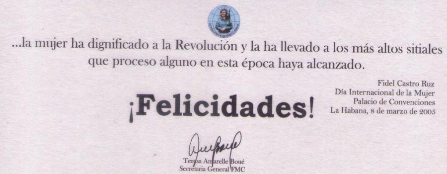 La Embajada de Cuba en Irlanda al expresarles nuestro profundo agradecimiento y reconocimiento, extensivo a otras Diputadas y amigas irlandesas en general que nos hicieron llegar sus saludos, hace llegar también en nombre de la Federación de Mujeres Cubanas cordiales felicitaciones y buenos deseos de éxitos en las luchas por la igualdad de géneros.