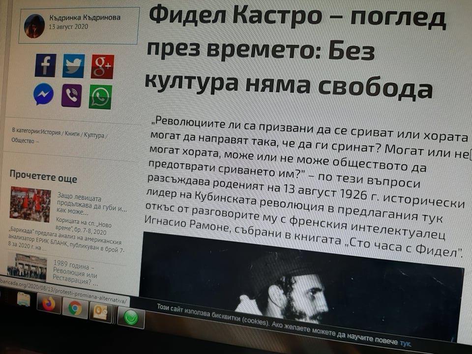 El sitio web del diario Barricada, de la Unión de Periodistas Hispanohablanes de Bulgaria rinde homenaje hoy a Fidel, en el 94 aniversario de su natalicion, con una bella crónica titulada "Fidel Castro - una mirada en el tiempo: sin cultura no hay libertad". https://baricada.org/2020/08/13/fidel-castro-cuba-revolucia/