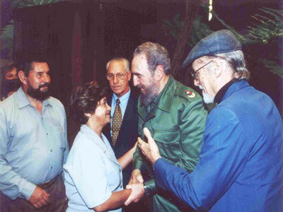 Gráfica pie de foto.- El poeta cubano y director de Casa de las Américas, Roberto Fernández Retamar; Gladys; y el poeta Jose Luis Diaz-Granados; saludan al comandante en Jefe Fidel Castro.