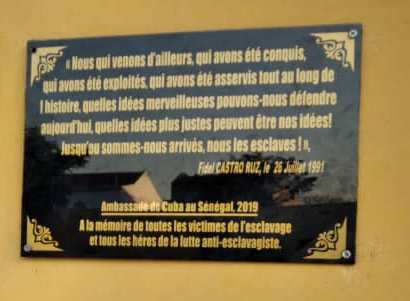 Esta placa en honor al Comandante la colocamos en la Isla de Gorea el año pasado. Entre tantos pensamientos de Fidel, queríamos encontrar uno que no sólo guardara relación con un lugar histórico como ese, sino que fuera también fuente de gratitud. Y fue este. Y sí, qué lejos hemos llegado los esclavos…Gracias, Fidel!