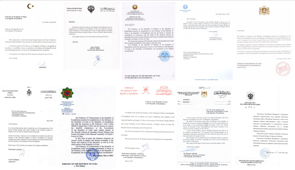 Nur-Sultán, 11 de mayo de 2022. La Embajada de Cuba en Kazajstán agradece profundamente a las personalidades que acudieron a su sede para firmar el libro de condolencias abierto con motivo del fallecimiento del ex presidente de la Asamblea Nacional del Poder Popular y ex Canciller, Ricardo Alarcón de Quesada, y a las embajadas acreditadas en este país que enviaron sus condolencias por escrito.