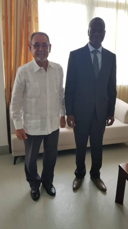 Cotonou, 24 de octubre de 2023.- El Embajador de Cuba en la República de Benin, Ricardo García Nápoles, se reunió en el día de hoy con el Director de Organismos Internacionales y Mantenimiento de la Paz, el Sr. Mahouton Mathieu Hounkarin. Durante el encuentro ambos diplomáticos pasaron revista a las buenas relaciones entre los dos países y abordaron temas relacionados con la situación internacional. CUBAMINREX. EMBACUBABENIN