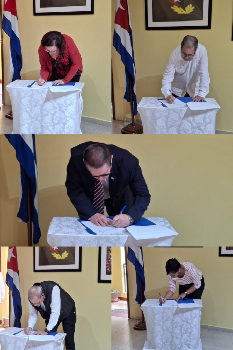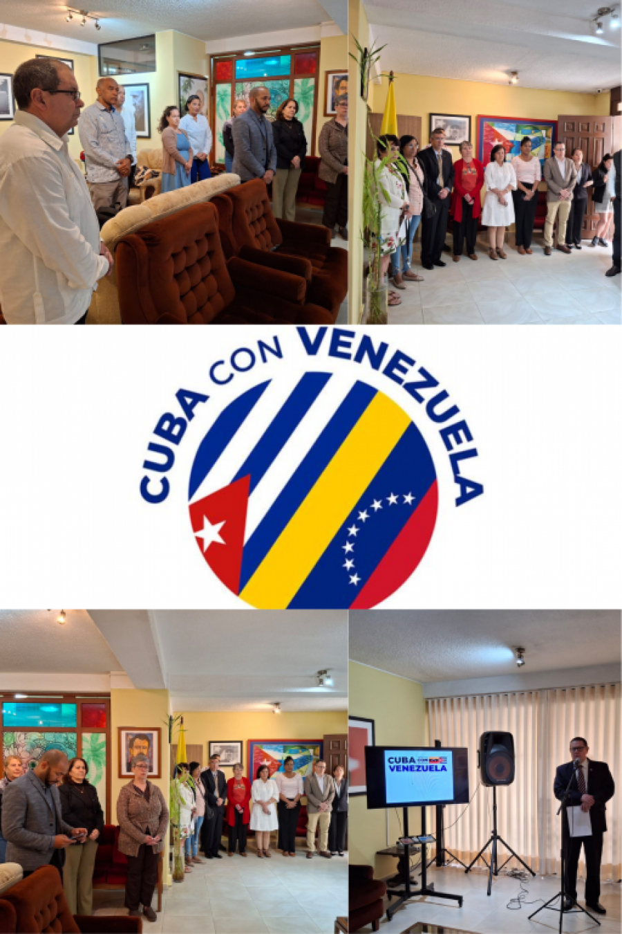 Quito, 30 de septiembre de 2025. Con la presencia del embajador Basilio A. Gutiérrez García, se llevó a cabo acto simbólico de solidaridad con la Revolución Bolivariana de Venezuela, dando inicio a la recogida de firmas de funcionarios y trabajadores de la Misión Estatal de Cuba en Ecuador, en apoyo a declaración del Gobierno Revolucionario Cubano “Urge detener la Agresión Militar contra la República Bolivariana de Venezuela”, manifestando su más rotundo apoyo a la Revolución Bolivariana.